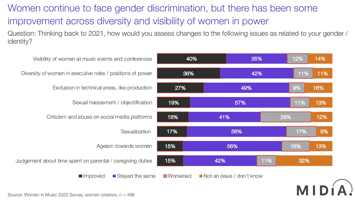 Despite the continued challenges, a bright spot lies in the visibility of women in the music industry at live events and conferences, among the few challenges perceived as improving by women creators (40%).