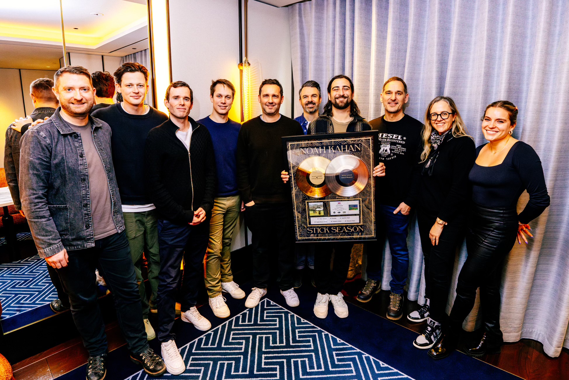 PHOTO: (L-R) Alastair Smith (Senior Director of Streaming and Commerce, Island Records), Jack McDonald (Junior Marketing Manager, Island Records), Sam Lunn (Director of Strategic Marketing, Island Records), Ryan Langlois (Artist Manager), Louis Bloom (President, Island Records), Drew Simmons (Artist Manager), Noah Kahan, Steve Pitron (Senior Vice President, Island Records), Nicola Spokes (Managing Director, Island Records), Zoe Briggs (Senior Director Global Marketing, Republic Records)