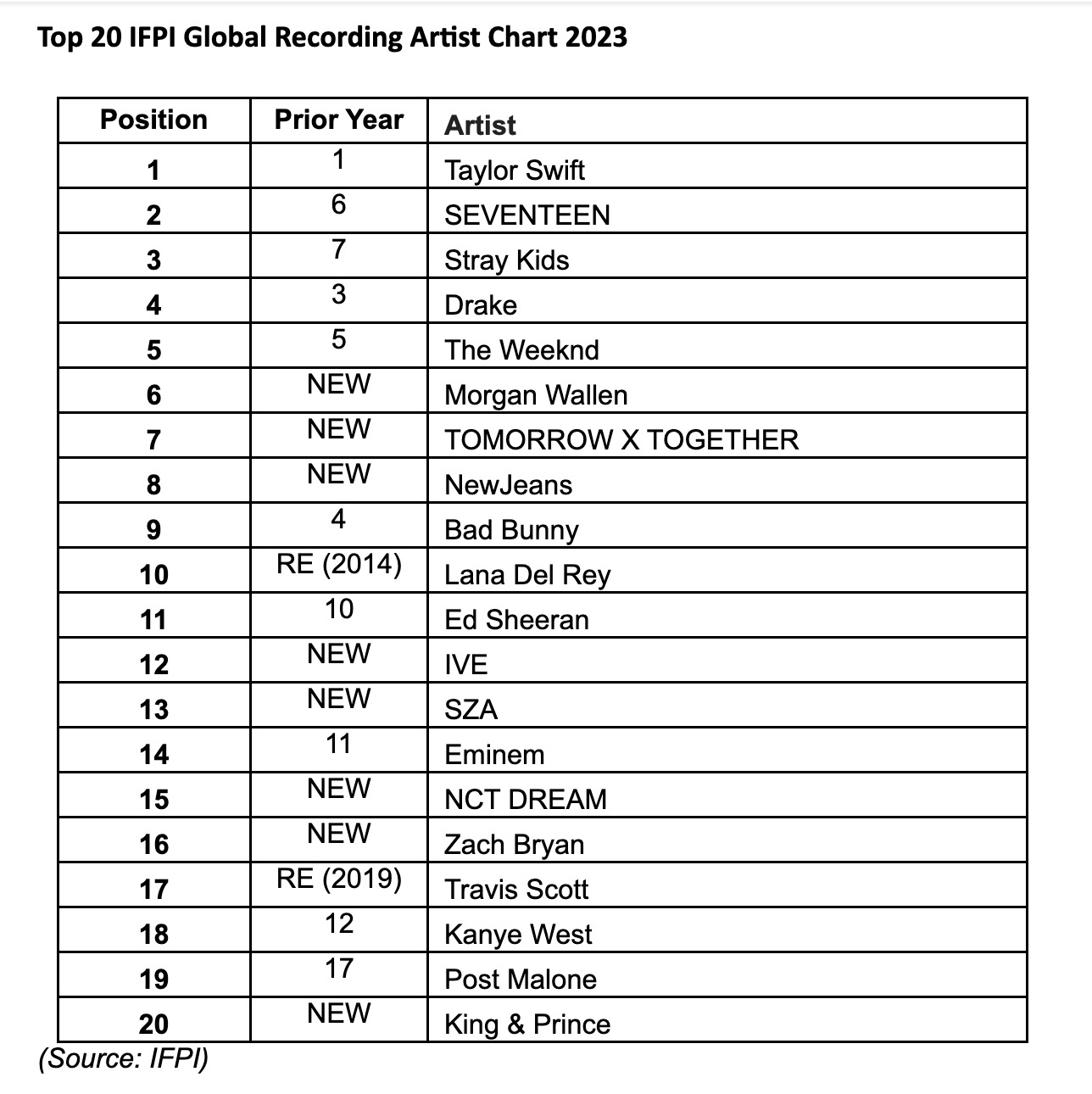 K-Pop stars Seventeen and Stray Kids placed second and third respectively in the chart in a record year for Korean artists. Four K-Pop acts featured in the Top 10 with Tomorrow X Together at No.7 and NewJeans at No.8, while IVE and NCT Dream also made their first appearances in the IFPI Global Artist Chart Top 20.