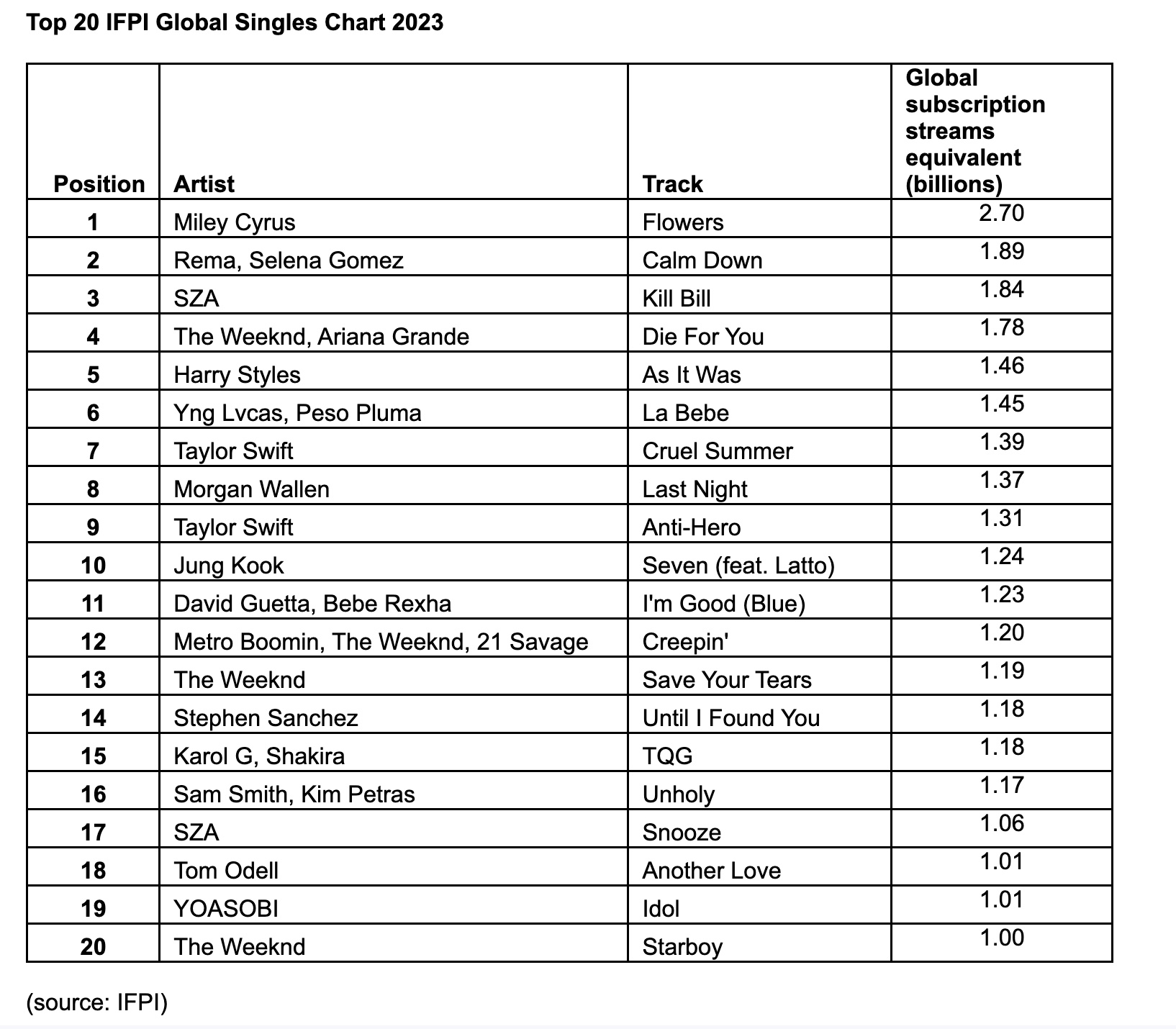 IFPI has revealed that Flowers by Miley Cyrus is the winner of the IFPI Global Single Award for 2023.