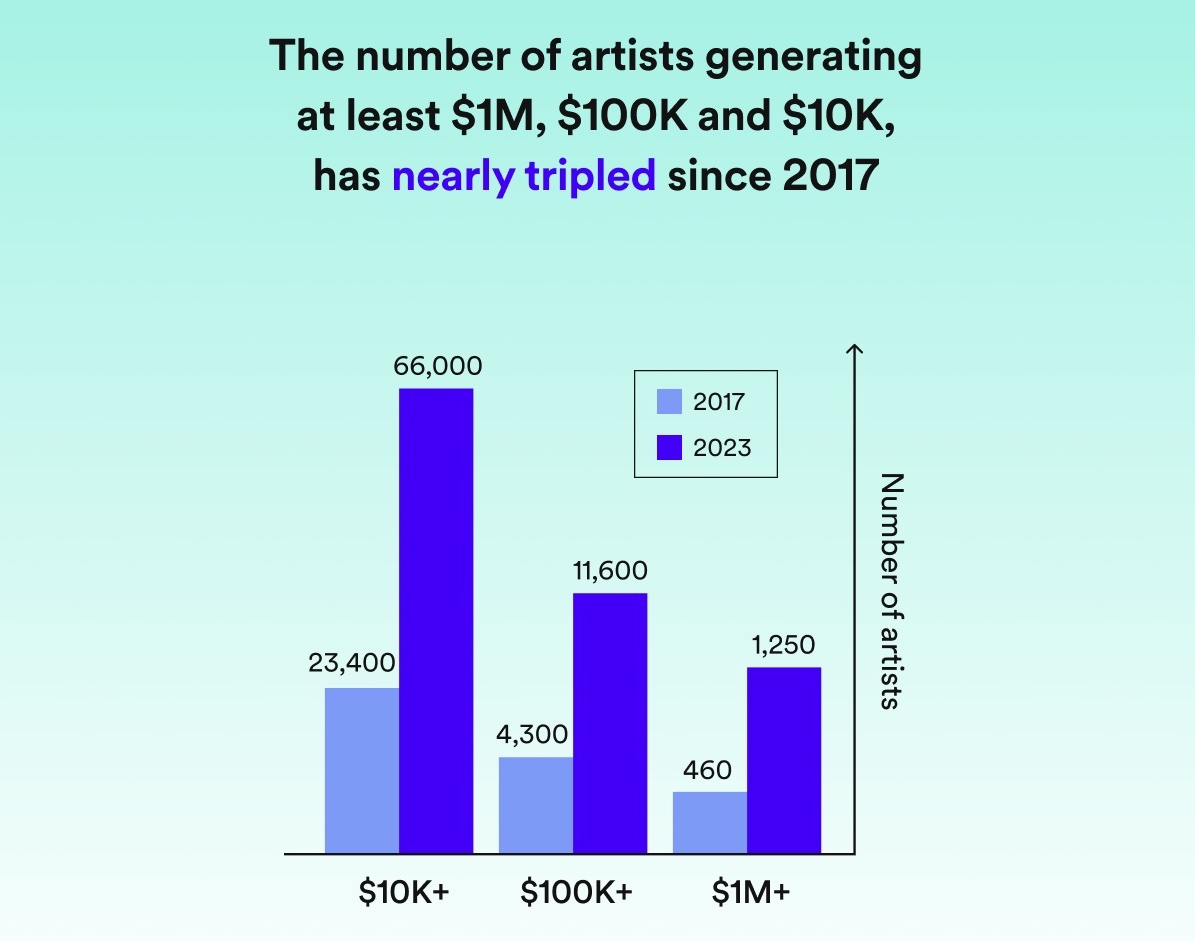 “One of the meaningful parts of publishing this data each and every year is to watch the scale of artists’ earnings transform over time. So this new data shows that the number of artists generating at least $10,000 in a year, or $100,000 in a year, or $1 million in a year, has nearly tripled since 2017. These are all first-time milestones for Spotify royalties, and it's pretty incredible to see these being set each and every year at every single level. We know we're empowering artists at every single level.”