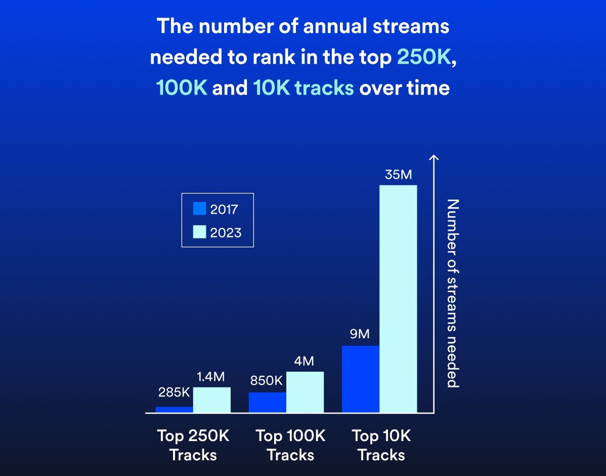 “We looked at our data, and we would say there's around 225,000 emerging and professional artists. These are the ones most dependent on streaming for their livelihoods. We hear about 10 million artists being on Spotify, but 10 million is just the people who have uploaded at least one track. It's highly likely that not every single one of those people is approaching it as a profession. When we were digging into the data, we found that more than half the people who uploaded to Spotify created less than a full album's worth of content, which in a lot of cases can be a fairly useful indicator of someone's professional intent. So by showing that stat we're trying to demystify that 10 million [figure], we want to provide context for those emerging and professional artists. So we don't see this as a scary place where there’s so much competition. We go into detail on how we get to that 225,000 [figure] in Loud & Clear as well.”